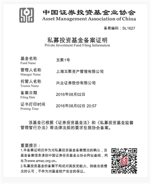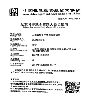五聚資產(chǎn)管理有限公司是依據(jù)中國(guó)證券投資基金業(yè)協(xié)會(huì)有關(guān)規(guī)定,在中國(guó)證券投資基金業(yè)協(xié)會(huì)規(guī)范備案登記的合格私募投資基金管理人,登記編號(hào)P1025883。